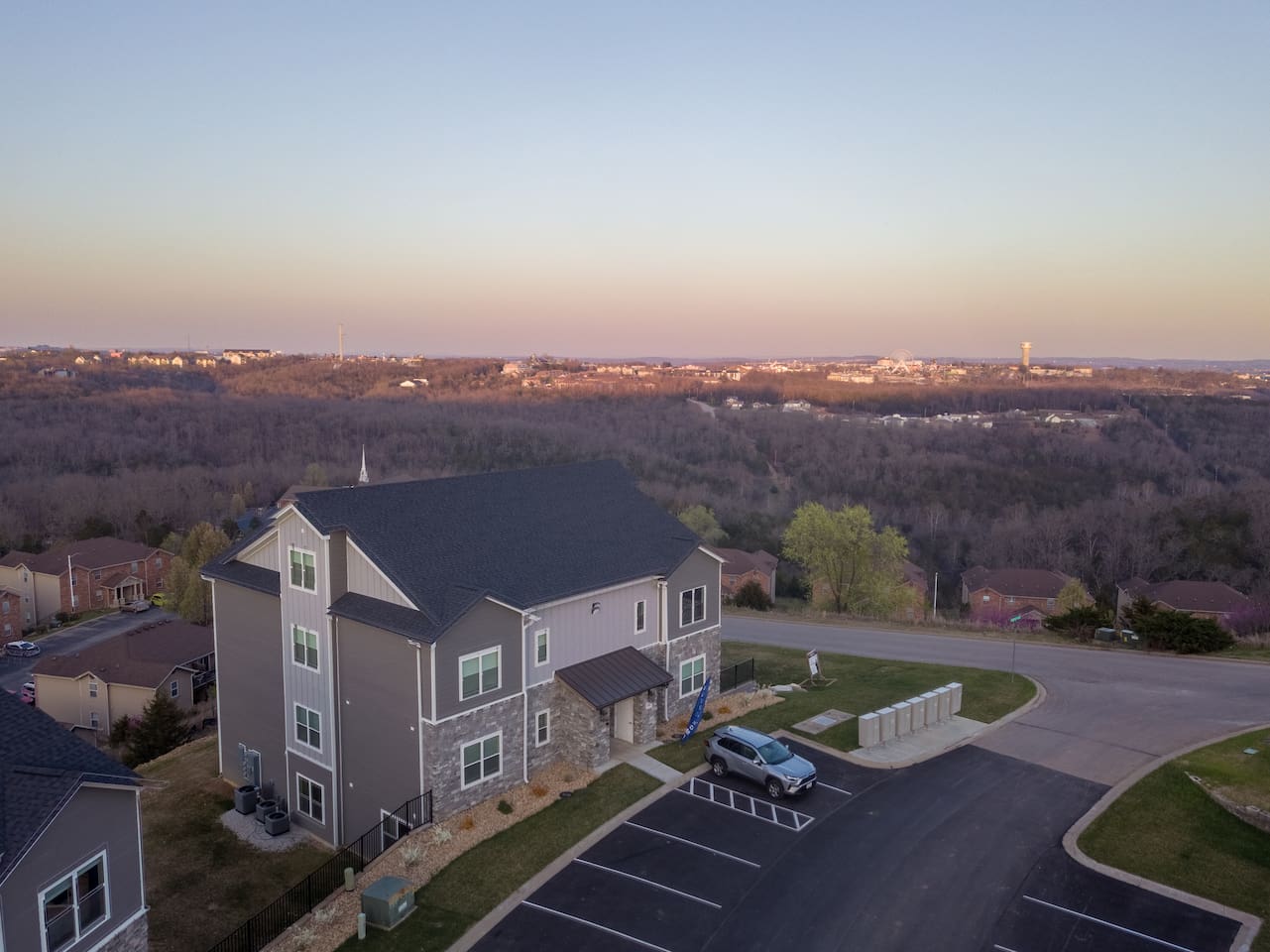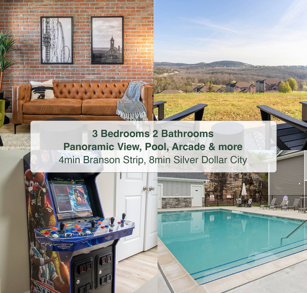 ☀ 3 bedroom and 2 bathrooms that accommodates up to 8 guests ☀ Panoramic View ☀ Pool, Arcades, Cornhole, board games ☀ 65" Smart TV ☀ 4min to Branson Strip, 8min to Silver Dollar City, 10min to Table Rock State Park with Lake access Welcome to our slice of Branson paradise! Nestled amidst the breathtaking Ozark Mountains and overlooking the vibrant Branson Strip perfect for hosting big family or friends comfortably to make memories together. Step into our newly constructed haven, where cleanliness meets serenity, creating an inviting atmosphere that beckons you to unwind and soak in all that Branson has to offer. SLEEPING: Accommodating up to 8 guests comfortably, our sleeping arrangements are designed with your utmost comfort in mind. And let's not forget our Zinus Memory Foam mattresses—guest favorites for their unparalleled comfort! - 1 King beds - 1 Queen Beds - 1 Bunk Bed (2 Twins Beds+ 1 Full Beds) KITCHEN: In our fully equipped kitchen, culinary adventures await! Whip up delicious meals with ease, thanks to our array of basic kitchen necessities. For a comprehensive list, be sure to check out our digital guidebook after booking. OUTDOOR: But the real showstopper? Our outdoor space, offering panoramic views that will leave you speechless! Step onto your private balcony, where you'll be greeted by sweeping vistas of the Branson Strip. Take a seat in our Adirondack chairs soaking in the sights and sounds of this vibrant city. FUN: And the fun doesn't stop there! We've curated a selection of entertainment options to ensure every moment is filled with joy and laughter. - Arcades - Cornhole - Board Games - 65" Smart TV - Community Pool: Quick 3 minutes walk. Usually opens May - August but it can change depending on the weather. Send us a message for availability. LOCATION: - 4 minute drive to the Branson Strip - 8 minute drive to Silver Dollar City - 10 minute drive to Table Rock State Park with Lake access - A lot of restaurant options within 6 minute drive BOOKING RULE: - You must be 25 to book - The person who booked must be present at the property for the duration of the reservation ACCESSIBILITY: There are walk down stairs leading to the main entrance of the property, but the property is located on the first level. For alternative access, you can enter the property through the balcony door which is pretty quick & easy to go around the lawn. HOUSE RULES: - No parties or large gathering ($500 fine) - No smoking - No fireworks or open fire - Please refrain from playing loud music - Quite hours 10pm - 8am. Please keep the noise down and respect the neighbors especially when you are outside. - Please do not let your pet on the furnitures (You can bring a clean sheet/blanket for them to lay on). If there is any excessive dog hair, stains or damage to the linens or furniture, there will be fees applied to compensate for additional necessary cleaning. - Do not turn off monitoring devices. - Relax & Enjoy the view! At our Branson retreat, your comfort and enjoyment are our top priorities. So come on in, kick back, and let the good times roll!